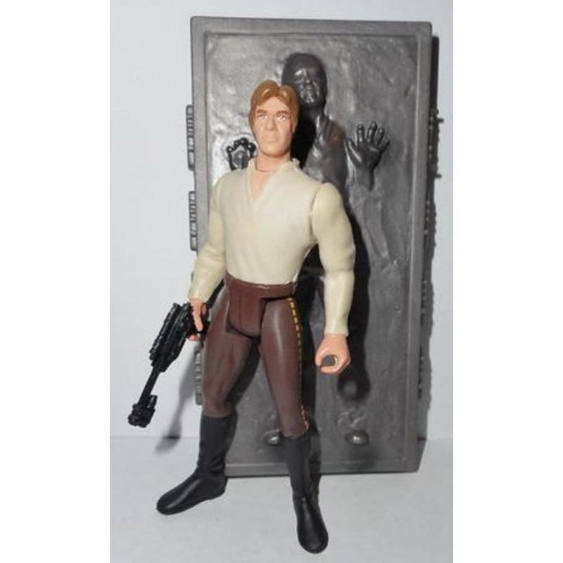 After escaping from Imperial forces in the Hoth system, Han Solo with Princess Leia, Chewbacca and C-3PO, landed the damaged Millennium Falcon on Bespin's Cloud City for repairs. The four put their trust in the city's administrator, , Lando Calrissian, unaware of the dangers awaiting them. A dashing ex-gambler and long-time acquaintance of Solo's, Calrissian had grudgingly made an agreement with Darth Vader to betray Solo and his friends. In return, the band would be set free once their capture had lured Luke Skywalker into Vader's grasp. The Dark Lord had no intention of keeping any promises: on his order a carbonite freezing chamber was modifies for use on humans, specifically Luke Skywalker, to render him helpless for safe delivery to the Emperor. To test the chamber, Solo was frozen and then turned over to bounty hunter Boba Fett for delivery to crime lord Jabba the Hutt. He became the favorite decoration in Jabba's palace on Tatooine, until a daring rescue attempt led by Luke Skywalker and Princess Leia freed Han and returned him to the enduring cause of the Rebel Alliance.