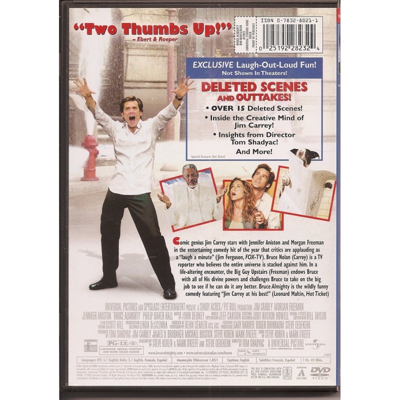 Comic genius Jim Carrey stars with Jennifer Aniston and Morgan Freeman in the entertaining comedy hit of the year that critics are applauding as a “laugh a minute” (Jim Ferguson, FOX-TV). Bruce Nolan (Carrey) is a TV reporter who believes the entire universe is stacked against him. In a life-altering encounter, the Big Guy Upstairs (Freeman) endows Bruce with all of His divine powers and challenges Bruce to take on the big job to see if he can do it any better. Bruce Almighty is the wildly funny comedy featuring “Jim Carrey at his best!” (Leonard Maltin, Hot Ticket)